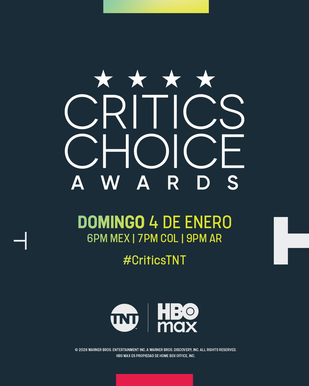 Este domingo 4 de enero a las 6 pm la Temporada de Premios 2026 comienza en TNT y HBO Max con la transmisión en vivo de la 31ª entrega anual de los CRITICS CHOICE AWARDS® desde Santa Mónica.